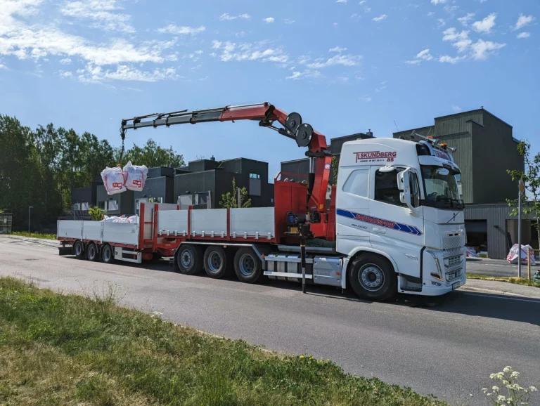 Vi håndterer tunge løft med både frem- og bakmontert kran, tilpasset ulike transportbehov.
